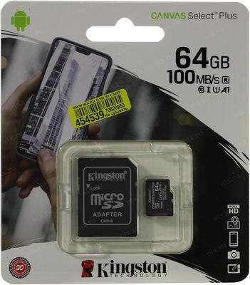 Карта памяти 64Гб Kingston SDCS2/64GB microSDXC Class 10 UHS-I Canvas Select up to 100MB/s с адапт.