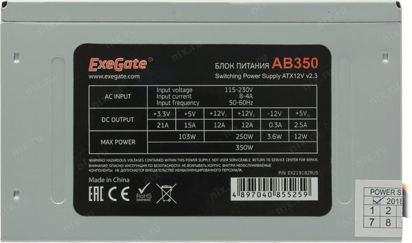 Блок питания ExeGate EX219182RUS ATX 350W 8см AB350, fan, 24p+4p, 3xSATA, 2xIDE, FDD