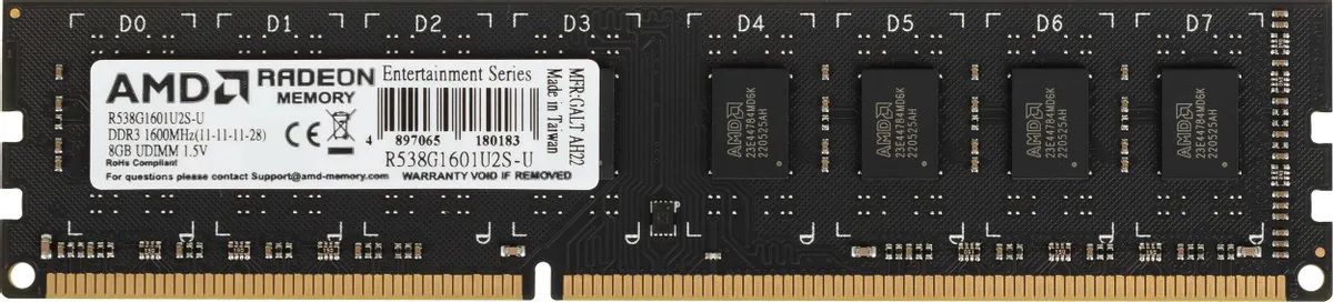 Оперативная память 8Гб AMD R538G1601U2S-U DDR3 PC3-12800 CL11 1,5V Radeon™ 1600 DIMM R3 Value Series Black Non-ECC, Retail