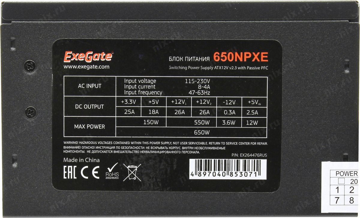 Блок питания ExeGate EX264476RUS ATX 650W 12см 650NPXE(+PFC), black, fan, 24+(4+4)p, (6+2)p PCI-E, 3xSATA