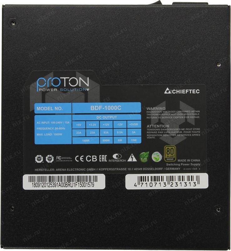 Блок питания Chieftec BDF-1000C ATX 1000W [Proton] МОДУЛЬНЫЙ, v.2.3/EPSx2, 80+BRONZE >85%, A.PFC, 6x PCI-E (6+2-Pin), 9x SATA, 3x MOLEX, Fan