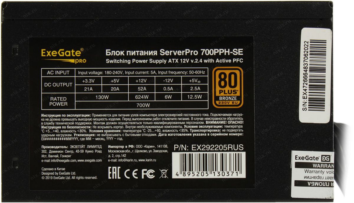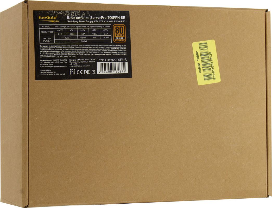 Блок питания ExeGate EX292205RUS ATX 700W 12см ServerPRO 80 PLUS® Bronze 700PPH-SE (, for 3U+ cases, APFC, КПД 89% (80 PLUS Bronze), fan, 24pin, 2x(4+4)p, 4xPCI-E, 6xSATA, 3xIDE, box, black)