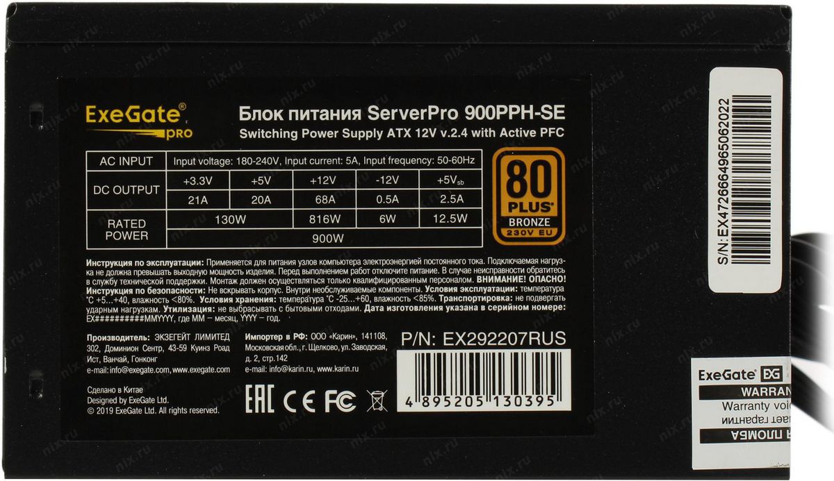Блок питания ExeGate EX292207RUS ATX 900W 12см Серверный БП ServerPRO 80 PLUS® Bronze 900PPH-SE (, for 3U+ cases, APFC, КПД 89% (80 PLUS Bronze), fan, 24pin, 2x(4+4)p, 4xPCI-E, 8xSATA, 4xIDE, box, black)