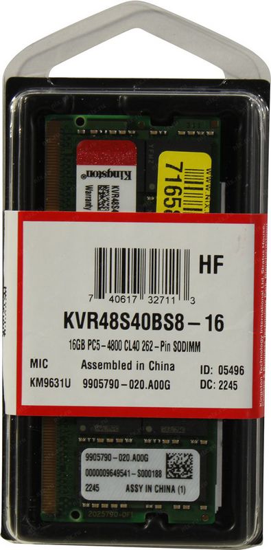 Оперативная память 16Гб Kingston KVR48S40BS8-16 DDR5 ECC PC5-38400 SODIMM CL40 4800MT/s