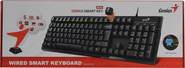 Описание Клавиатура Genius Smart KB-102 Black USB Only Laser (High Key Design), программируемая мультимедийная с технологией SmartGenius, классическая раскладка, глубокий ход клавиш, влагоустойчивая, клавиш 105, провод 1.5 м