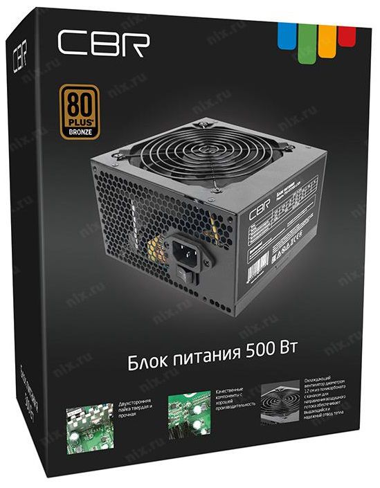 Блок питания CBR PSU-ATX500-12GM ATX 500W 12см 80+ Bronze, APFC, 0.6mm, 20+4pin, 1x8-pin(4+4P), 2x6+2pin, 4xSATA, 4xIDE, fan, 1.5м кабель питания, черный
