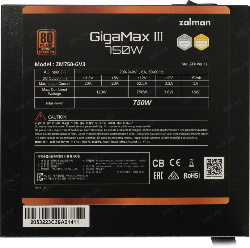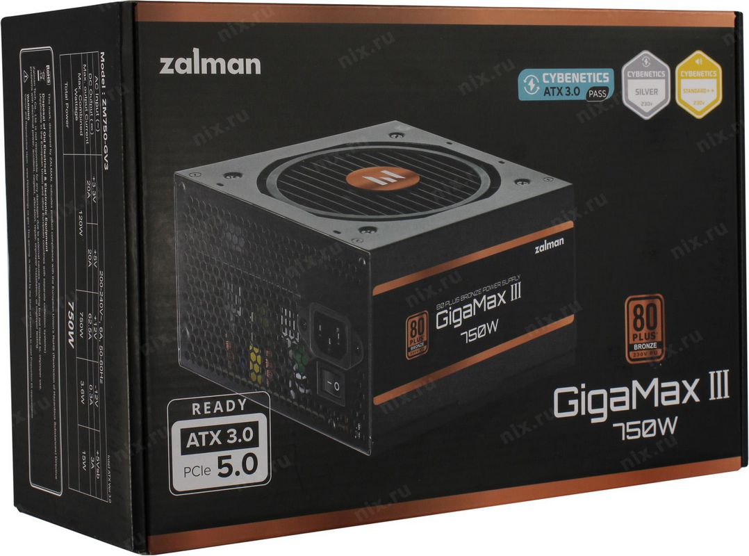 Блок питания Zalman ZM750-GV3 ATX 750W 12см 12V v3.0, Gen 5.0, APFC, Fan, 80+ Bronze, Retail