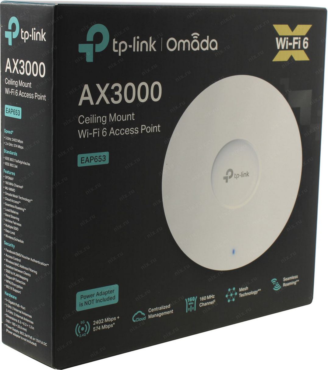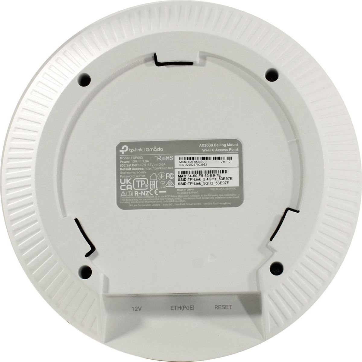 Точка доступа TP-Link EAP653 Потолочная TP-Link AX3000 Ceiling Mount Dual-Band Wi-Fi 6 , 1x1Gbps RJ45 Port, 574Mbps at 2.4 GHz + 2402 Mbps at 5 GHz, 802.3at POE, 2xInternal Antennas