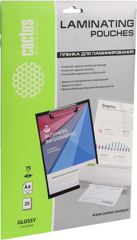 Пленка для ламинирования Cactus CS-LPGA47525 A4 25л. 75мкм глянц. 216x303мм