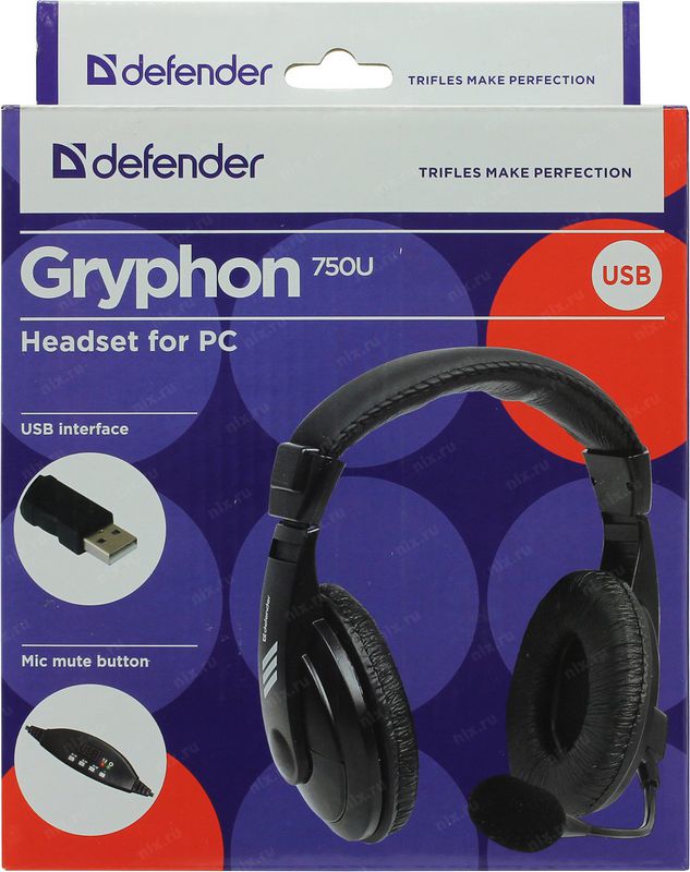 Гарнитура Defender 63752 черный 1,8м Gryphon 750U USB, кабель