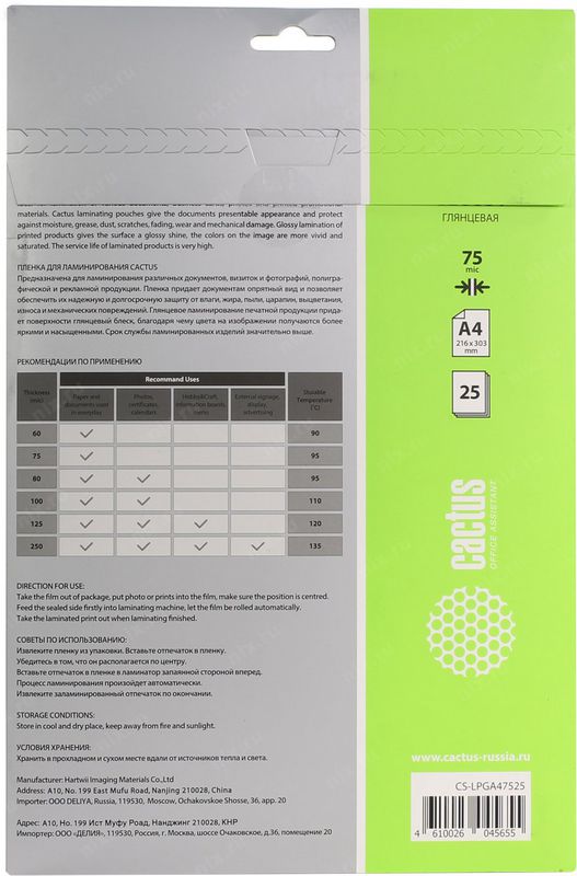 Пленка для ламинирования Cactus CS-LPGA47525 A4 25л. 75мкм глянц. 216x303мм