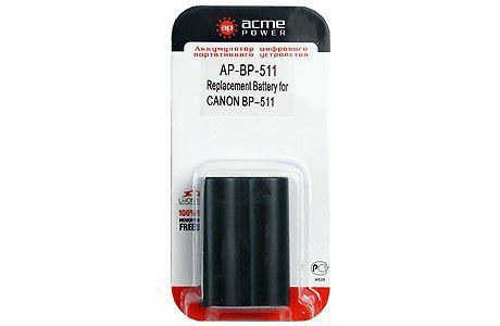 Аккумулятор AcmePower BP-511 для Canon PowerShot G1/ G2/ G3/ G5/ G6/ Pro90 IS/ Pro1/ EOS 30D/ EOS 300D/ EOS 40D/ EOS 5D/ EOS 50D/ Digital Rebel/ 10D/ 20D/ 20Da/ 5D/ D30/ D60/ MV-30i/ 300 series/ 400 series/ 500 7,4V, min 1450mAh, Li-ion