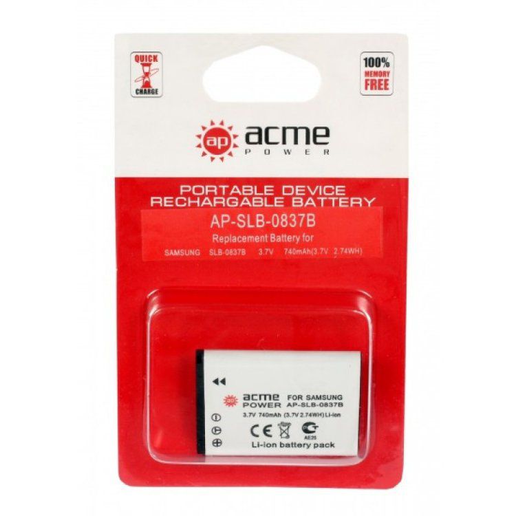 Аккумулятор AcmePower SLB-0837B для Samsung NV8/ NV15/ NV20/ L201/ L83T/ L830/ Digimax L70 3,7V, min 640mAh, Li-ion