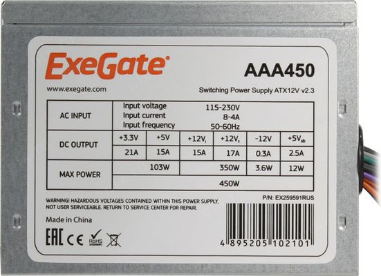 Блок питания ExeGate ES259591RUS ATX 450W 8см AAA450, fan, 24p+4p, 2xSATA, 1xIDE