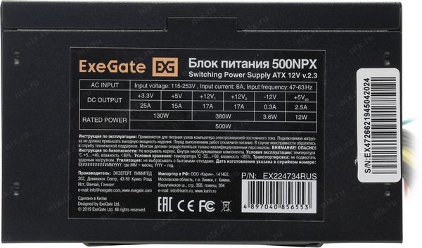 Блок питания ExeGate EX224734RUS ATX 500W 12см 500NPX, black, fan, 24p+4p, 6/8p PCI-E, 3xSATA, 2xIDE, FDD