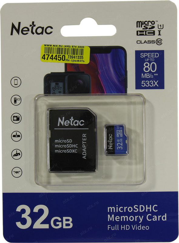Карта памяти 32Гб Netac NT02P500STN-032G-R microSDHC SD адаптер