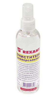 Очиститель универсальный 200мл (с распылителем) REXANT предназначен для "мягкой" очистки или обезжиривания различных предметов. Применяется для очистки радиоэлектронных элементов (печатные платы, контакты реле и прочие), очистки оптического оборудования (линзы стекла, объективы), бытовых нужд (чистка зеркал, оконных стекол, хрусталя, как жидкое топливо в спиртовка и зажигалках, растопка древесного угля), в автомобильном деле (очистка и удаление влаги из бензобака автомобиля, антизамораживатель стеклоомывающей жидкости при минусовых температурах), при монтаже и обслуживании волоконно-оптических кабелей (ВОЛС), обслуживания аудио и видео оборудования и других целей. Представляет собой бесцветную прозрачную жидкость без механических примесей с характерным запахом. Очиститель является хорошим растворителем для различных эфирных масел, при промывке высокотехнологичных узлов и агрегатов, как обезжиривающее средство. Он быстро испаряется, не оставляя пятен на металлических или стеклянных поверхностях. Для быстрого и удобного нанесения флакон оборудован распылителем. Основные характеристики: