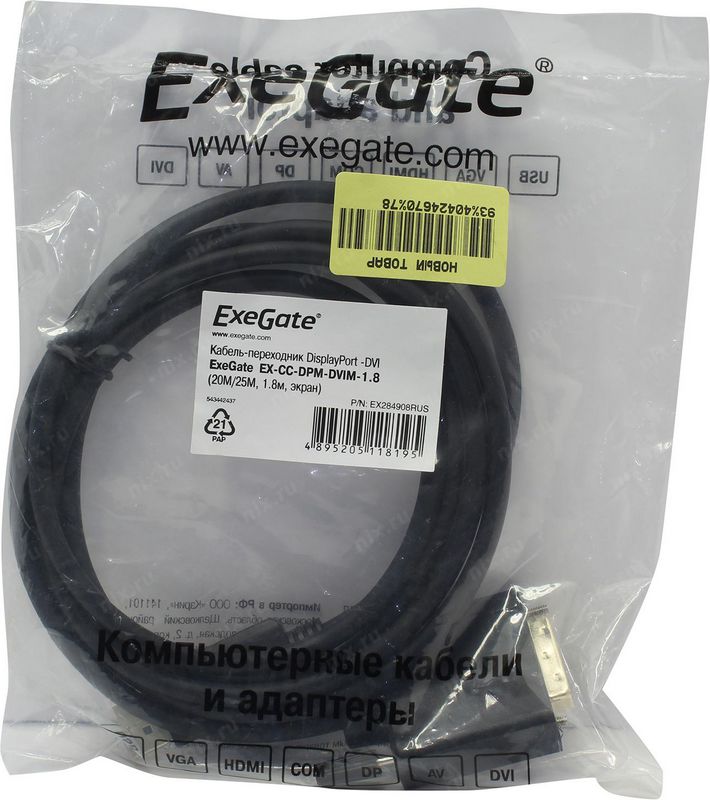 Кабель аудио-видео ExeGate EX284908RUS DisplayPort (M)-DVI-D (M) 1,8м