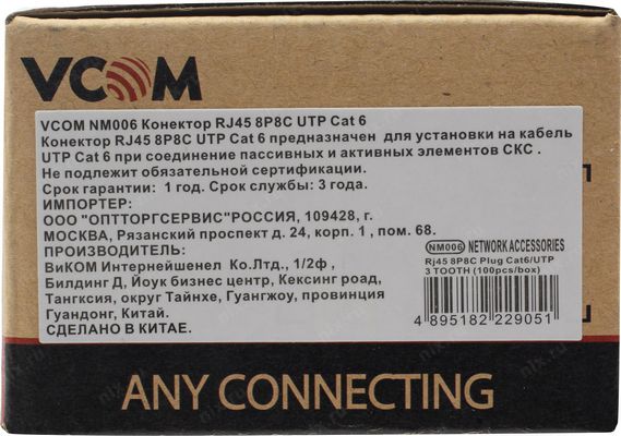Коннектор VCOM NM006-1/100 RJ-45 кат.6 8P8C 100шт для UTP кабеля