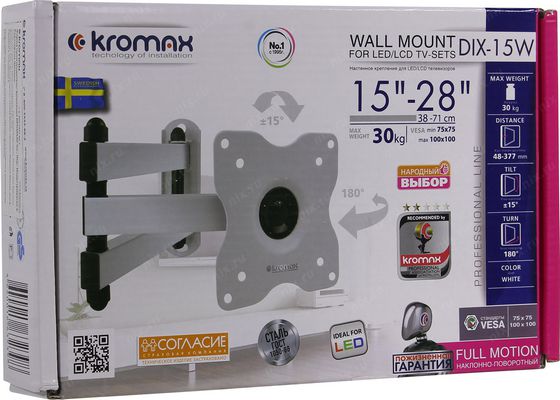 Кронштейн Kromax DIX-15 белый для телевизора 15”-28” наклонно-поворотный до 30кг