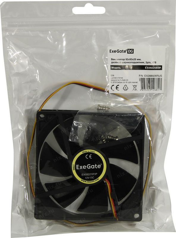 Вентилятор для корпуса ExeGate EX288926RUS 92x92x25 3pin EX09225B3P ( 2-Ball (двойной шарикоподшипник), 2100RPM, 27dBA)