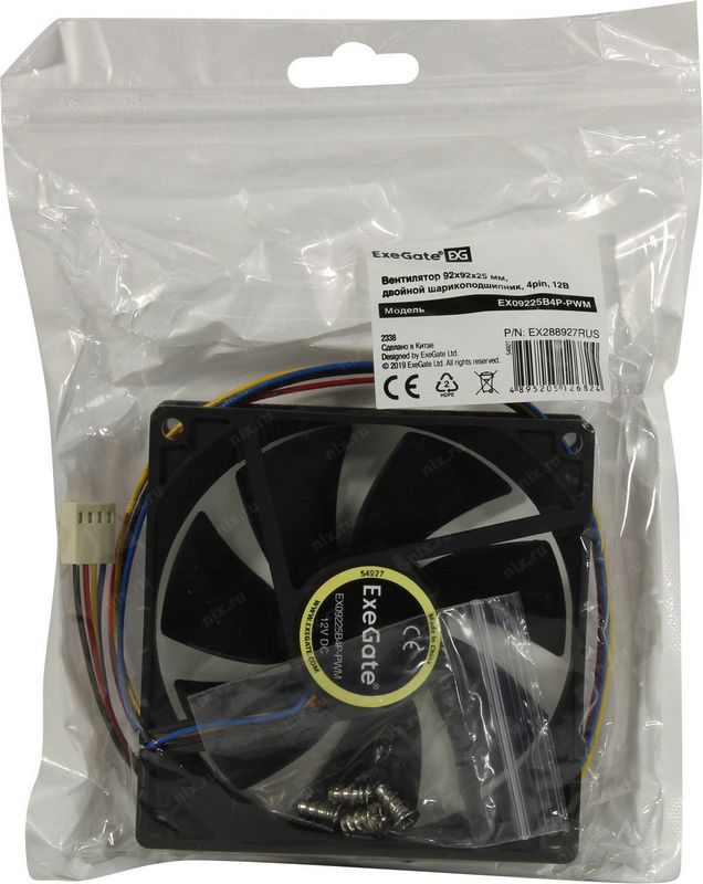 Вентилятор для корпуса ExeGate EX288927RUS 92x92x25 4pin EX09225B4P- ( 2-Ball (двойной шарикоподшипник), 29dBA)