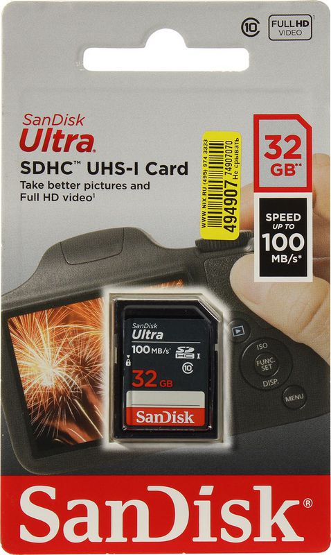 Карта памяти 32Гб SanDisk SDSDUNR-032G-GN3IN SDHC Class 10 UHS-I Ultra , 100 МБ/с, Class 10, 1 шт.
