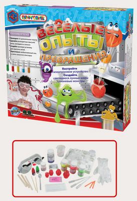 Набор «Веселые опыты и превращения» идеальный подарок для юных любителей потрясающих опытов и новых открытий. Занимаясь с набором, ребенок сможет провести 15 увлекательнейших экспериментов: построить потрясающую установку для запуска мячей, приготовить необычные гели, слепить светящиеся шарики и слизневых монстриков и многое-многое другое. Данный набор позволяет в игровой форме получить интересные и полезные сведения о свойствах химических веществ. Проведение игровых опытов с набором способствует развитию внимания, логического мышления, скорости реакции у детей.В состав набора входит все самое необходимое для работы а также красочно иллюстрированная инструкция.Составные компоненты набора соответствуют европейским стандартам безопасности игрушек.