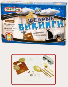 Набор «Щедрые викинги» разработан для юных историков и археологов, а также для всех любителей захватывающих путешествий в прошлое. Играя с набором, дети смогут узнать об особенностях удивительной жизни викингов и их древних рун, тайне происхождения молота Тора, найти спрятанные древние сокровища, своими руками реконструировать ожерелье воина-викинга. Набор дает возможность юным исследователям в легкой и доступной игровой форме открыть для себя уникальные загадки истории. Занятия с набором способствуют развитию внимания, образного мышления, интереса к истории и расширению кругозора у детей. В состав набора входят: имитация камня, осадочная порода, качественные копии артефактов, формы для изготовления талисманов, лист с волшебными рунами, копии инструментов археолога, защитная маска и очки, справочник исследователя. Составные компоненты набора соответствуют европейским стандартам безопасности игрушек.