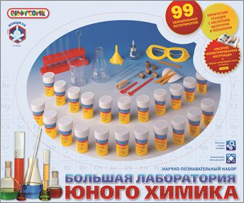 Научно-познавательный набор "Большая лаборатория юного химика" станет замечательным подарком юному исследователю. Занимаясь с набором, ребенок сможет создать собственную лабораторию и понять, как взаимодействую друг с другом те или иные вещества. С помощью набора ваш ребенок сможет провести 99 увлекательных экспериментов с кислотами, щелочами и металлами, благодаря которым создаст невидимые чернила и химические часы, а также вырастит большие кристаллы.