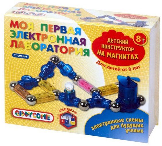 Игровой конструктор на магнитах QIDDYCOME «Моя первая электронная лаборатория» - отличная стартовая площадка для детей, интересующихся электроникой. В Набор входят образцы настоящих технических деталей: двигатель (1 шт.), транзистор (1 шт.), лампа (1 шт.), резистор (3 шт.), переменный резистор (1 шт.), фоторезистор (1 шт.), светодиод (1 шт.), выключатель (1 шт.), а также батарейный блок. Все электронные компоненты Набора легко и быстро соединяются между собой при помощи магнитных контактов и стальных шариков. Удобная и функциональная система соединения позволяет построить 10 различных электрических схем: лампу, электромотор и другие. Электронные схемы можно дополнить и украсить магнитными деталями из других