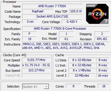 Характеристики: Raphael, 5nm, C8 T16, Base 4,50GHz, Turbo 5,40GHz, RDNA 2 Graphics, L3 32Mb, TDP 105W, SAM5}