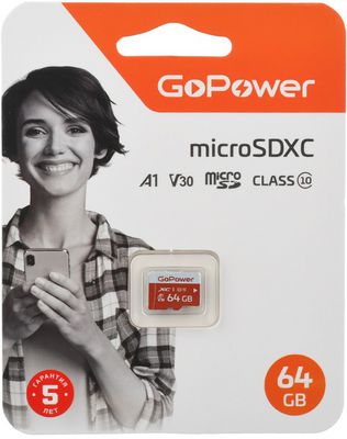 Карта памяти 64Гб GoPower 00-00025681 Micro SD Class 10 UHS-I (U3) 100 МБ/сек V30 без адаптера