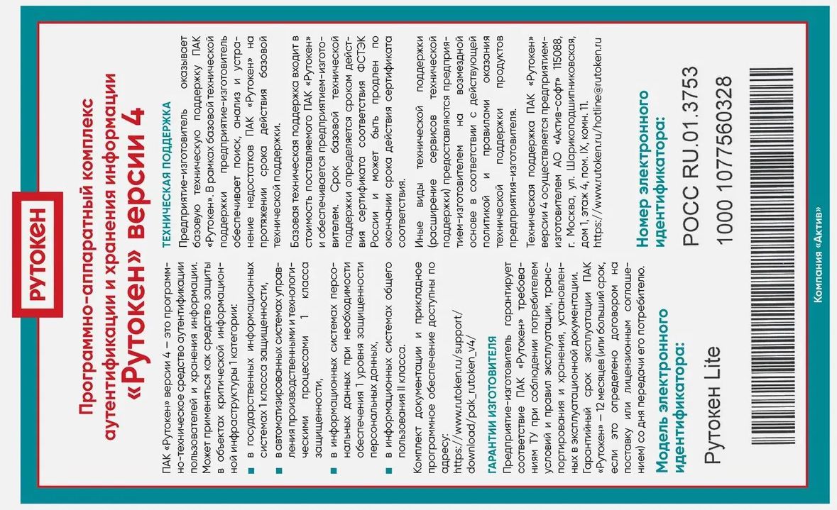 Бренд RUTOKEN Описание Рутокен Lite инд.уп. соответствует новым требованиям ФНС для получения Квалифицированной подписи. Носитель поставляется в индивидуальной упаковке с сертификатом ФСТЭК России.