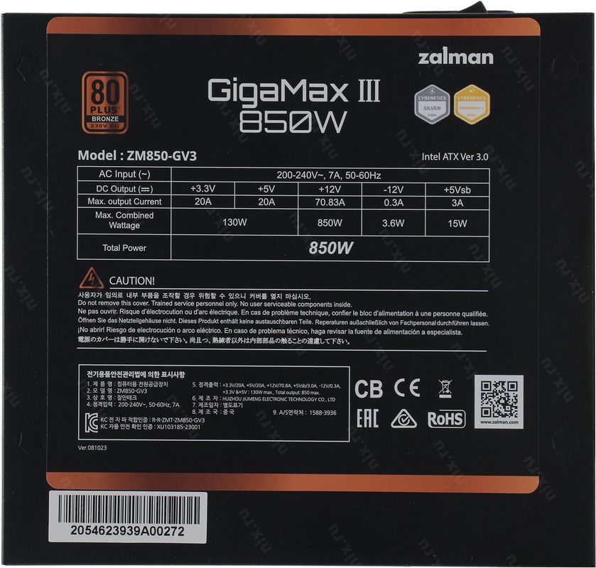 Блок питания Zalman ZM850-GV3 ATX 850W 12см 12V v3.0, Gen 5.0, APFC, Fan, 80+ Bronze, Retail