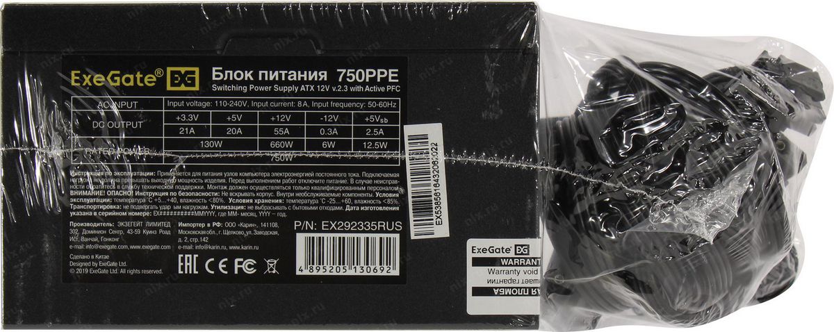 Блок питания ExeGate EX292335RUS-S ATX 750W 12см 750PPE, (, APFC, SC, КПД 80% (80 PLUS), fan, 24pin, 2x(4+4)pin, 4xPCI-E, 6xSATA, 3xIDE, black, кабель 220V 1,8м с защитой от выдергивания)