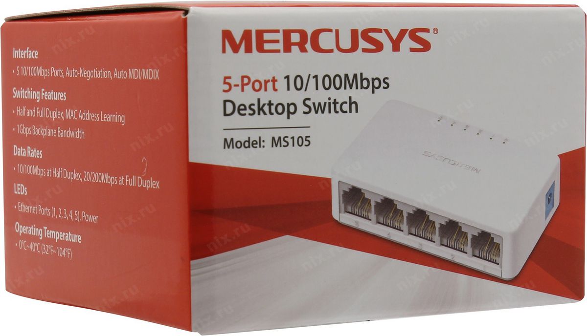 Коммутатор Mercusys MS105 5-портов 100Mbps 10 100 Мбит с настольный , RJ45 10 100 Мбит с, пластиковый корпус