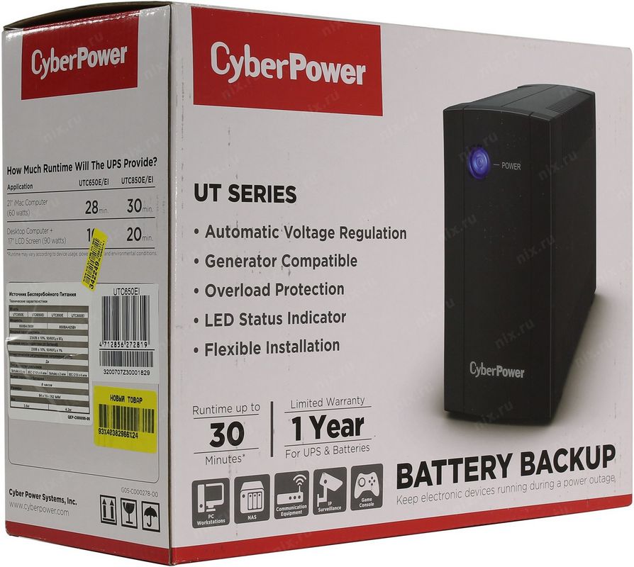 ИБП CyberPower UTC650EI [Line-Interactive, Tower, 650VA/360W (IEC C13 x 4), 12В/5 Ач х 1} (UTC650EI)