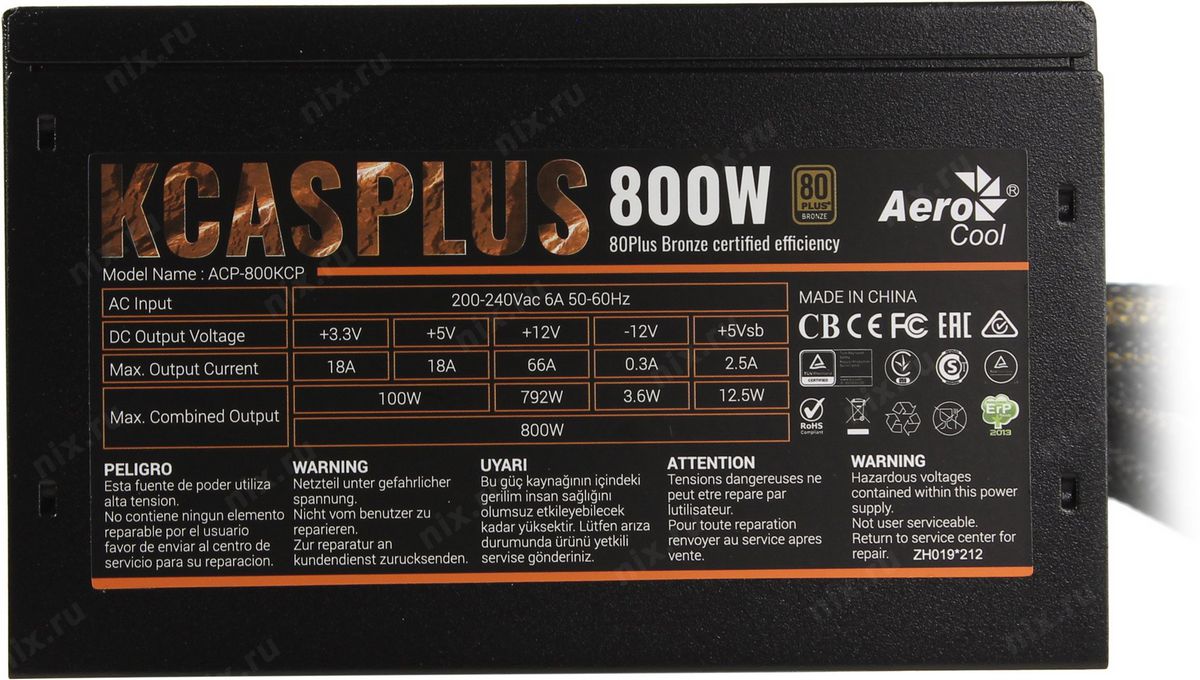 Блок питания Aerocool KCAS-800W PLUS ATX 800W 80+ bronze (24+4+4pin) APFC 120mm fan 7xSATA RTL