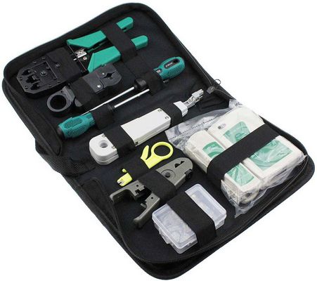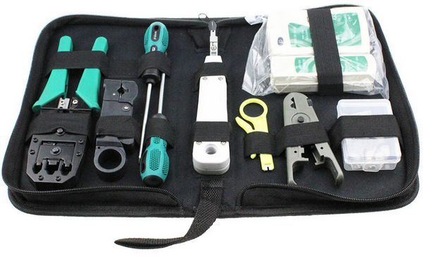 нож для зачистки проводов (RG59/58/56/62/63 3V2V/4C/5C коаксиальные кабели), плоскую/крестовую отвертку, нож для зачистки, разъемы RJ45, резак UTP/STP, сумка
