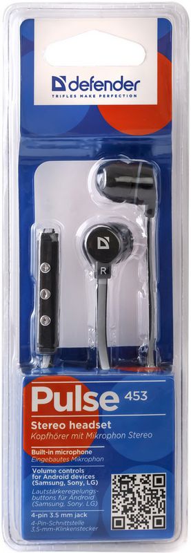 Гарнитура Defender 63453 черный 1,2м Pulse-453 , для Android 4-пин 3,5 мм jack, плоск.
