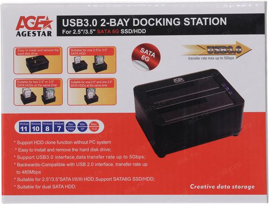 Док-станция Agestar 3UBT8 SATA USB3.0 пластик/алюминий серебристый для HDD 2.5”/3.5”
